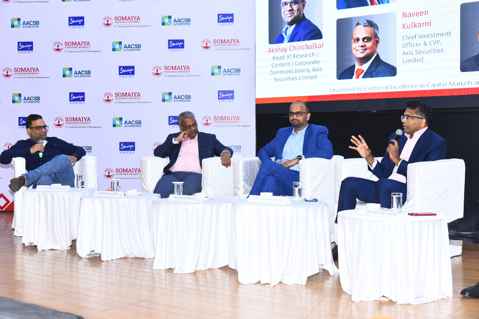 Investrix 2025, a panel discussion on the investment landscape, was organised by Finstreet, the Finance Committee of K J Somaiya Institute of Management, on February 08, 2025. The Investrix panel comprised prominent industry leaders, including Akshay Chinchalkar (Head of Research, Content, and Corporate Communication, Axis Securities), Kaustubh Sule (Senior Fund Manager, Groww Mutual Fund), Saurav Bhatia (Head of Macro Strategy and Fixed Income, Sapient Finserv), Naveen Kulkarni (CIO & EVP, Axis Securities PMS), Vetri Subramaniam (CIO, UTI Asset Management), and Samir Lodha (Founder & Managing Director, QuantArt).